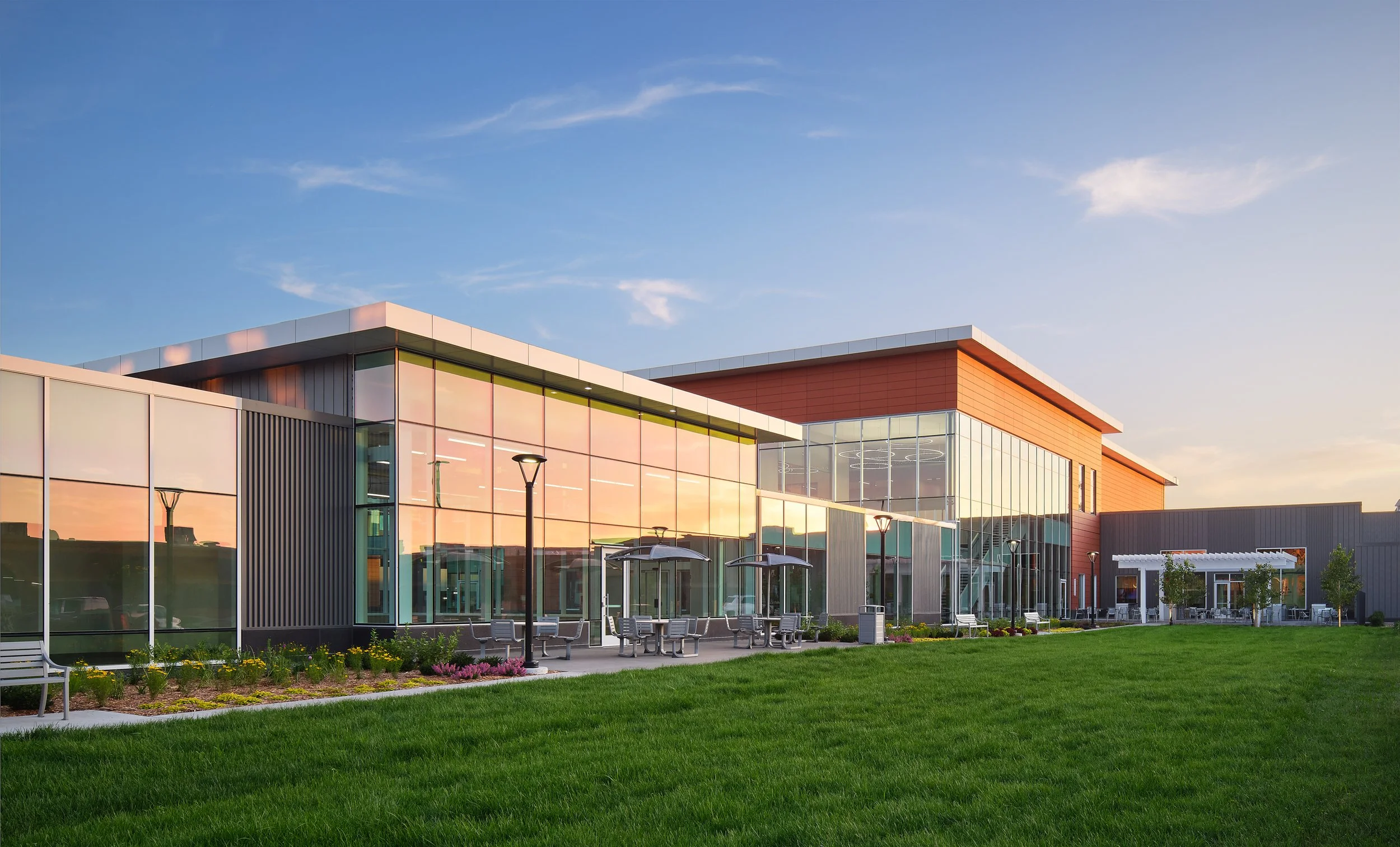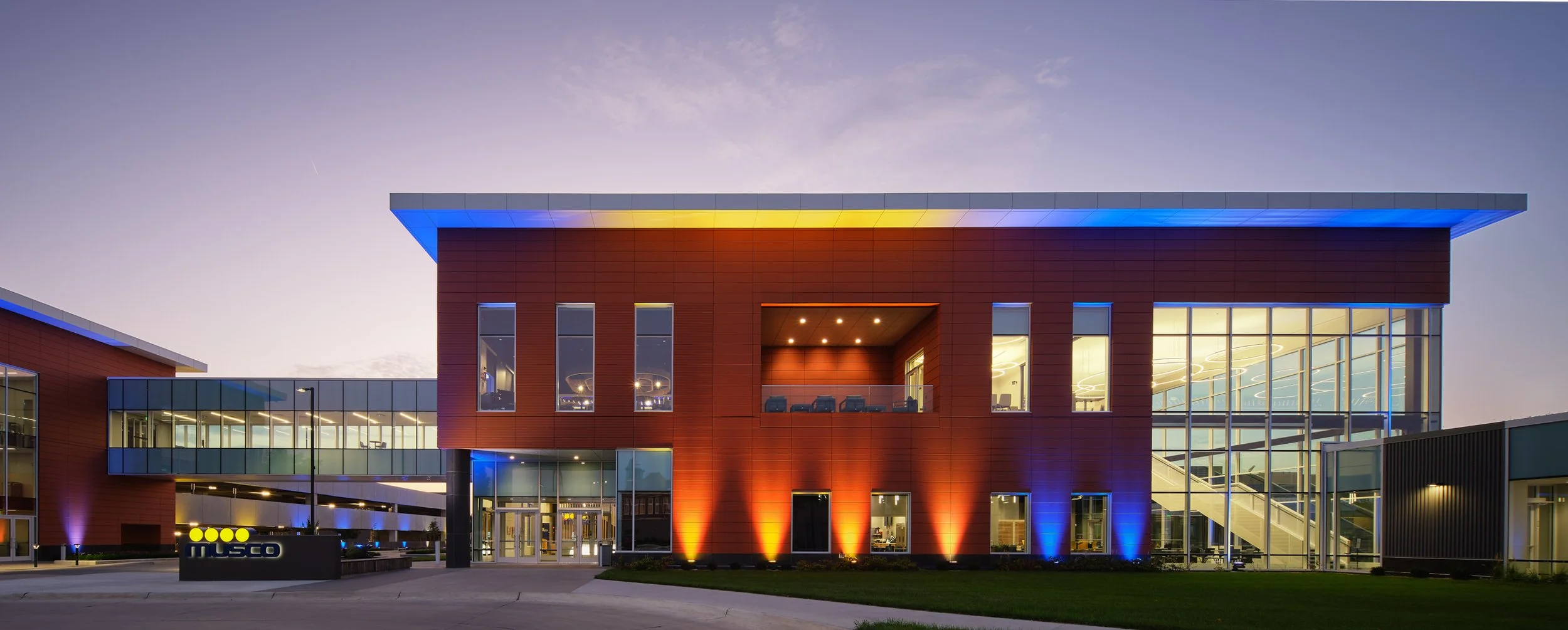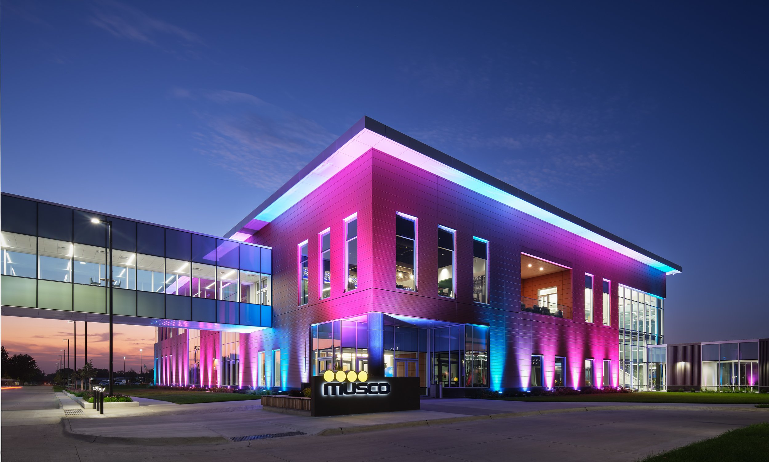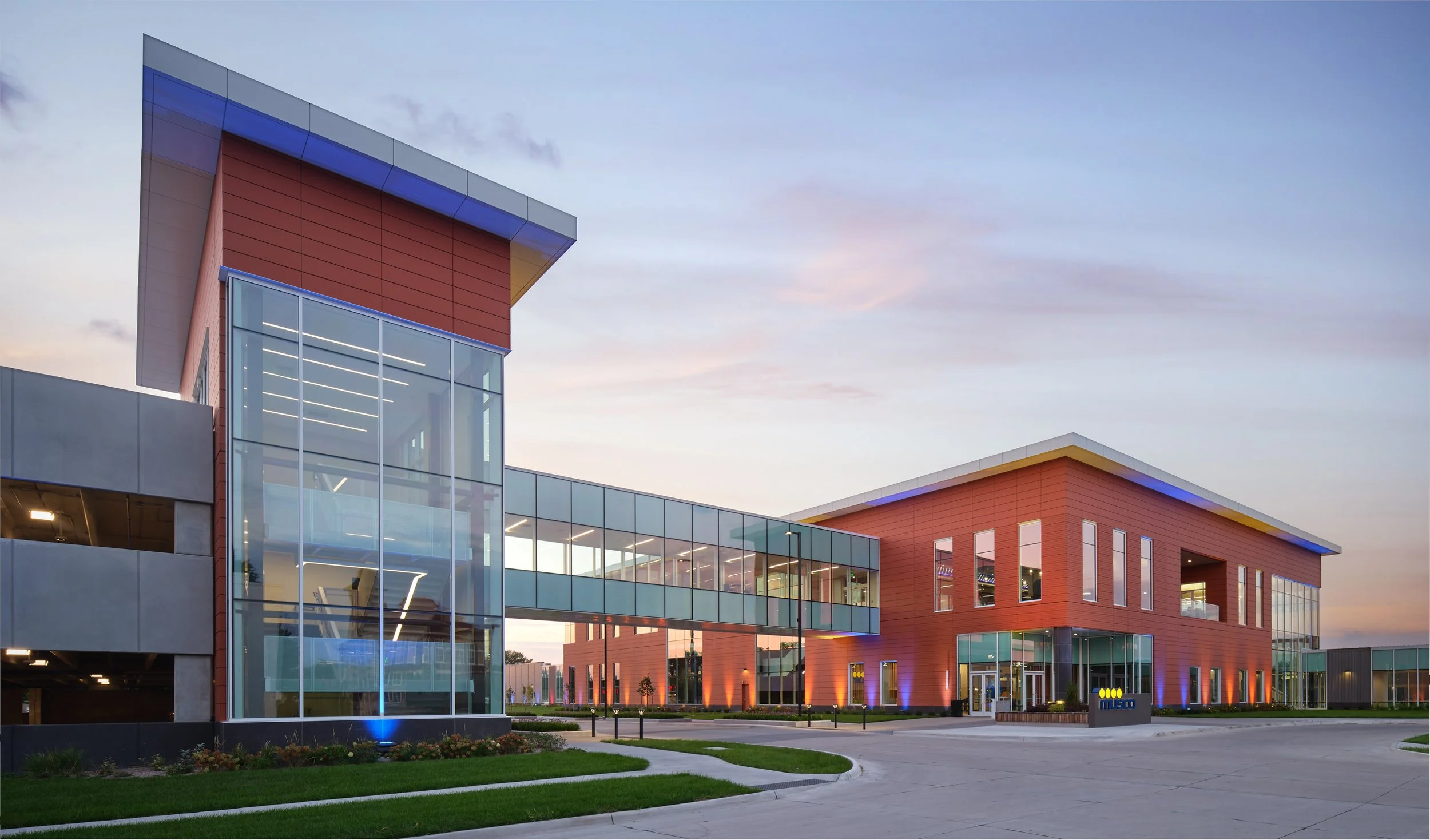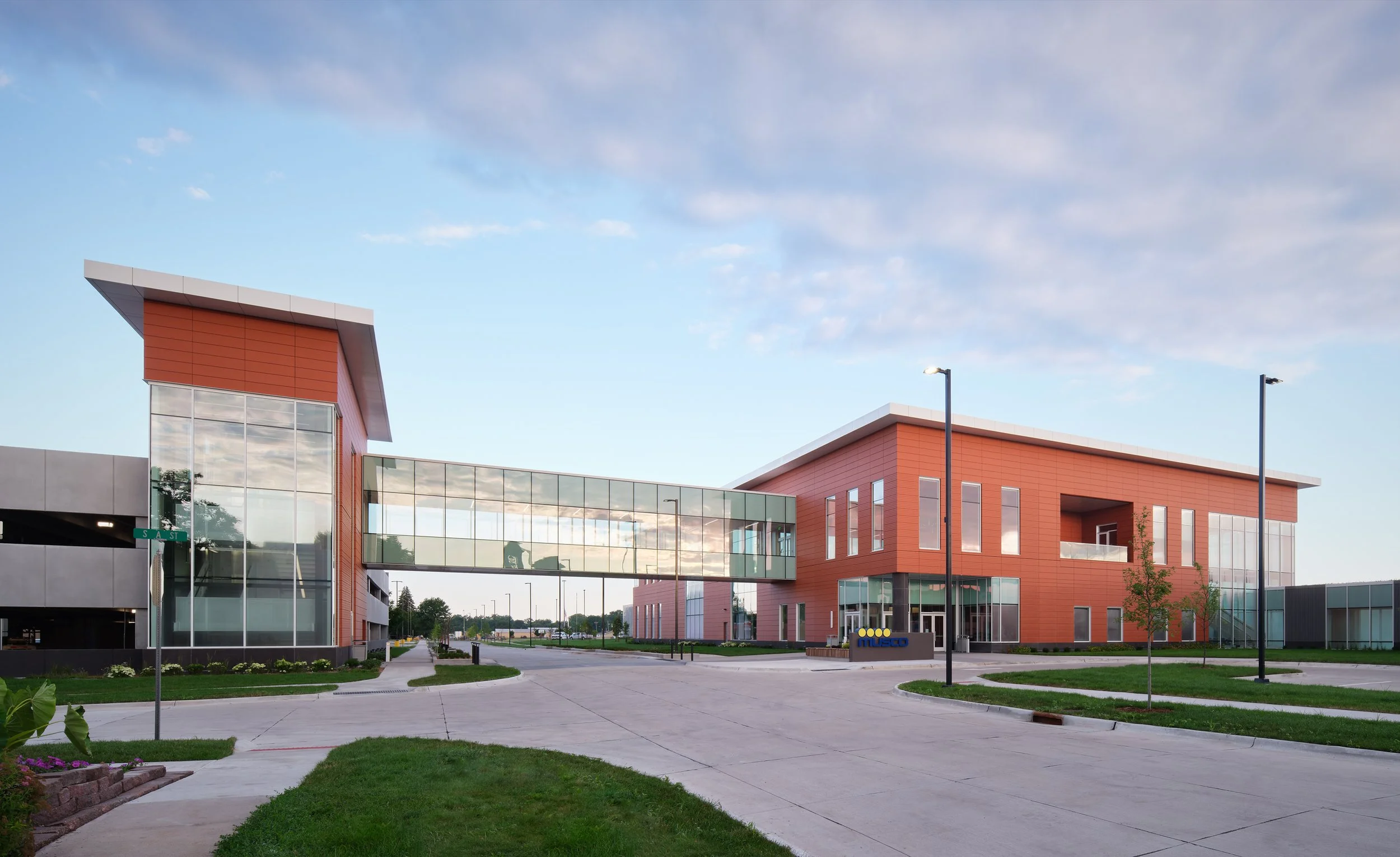 Musco Sports Lighting recently underwent a 74,000 square-foot office renovation and expansion at their corporate headquarters located in downtown Oskaloosa, IA. With design lead by SVPA Architects and construction completed by Neumann Brothers of Des Moines, IA, a three-floor parking garage was also added to help accommodate employees - holding approximately 400 vehicles connected by a second story skywalk. Providing both architectural photography and aerial drone photography was critical to help capture the scale of the project and share the story of the companies vision and expansion.