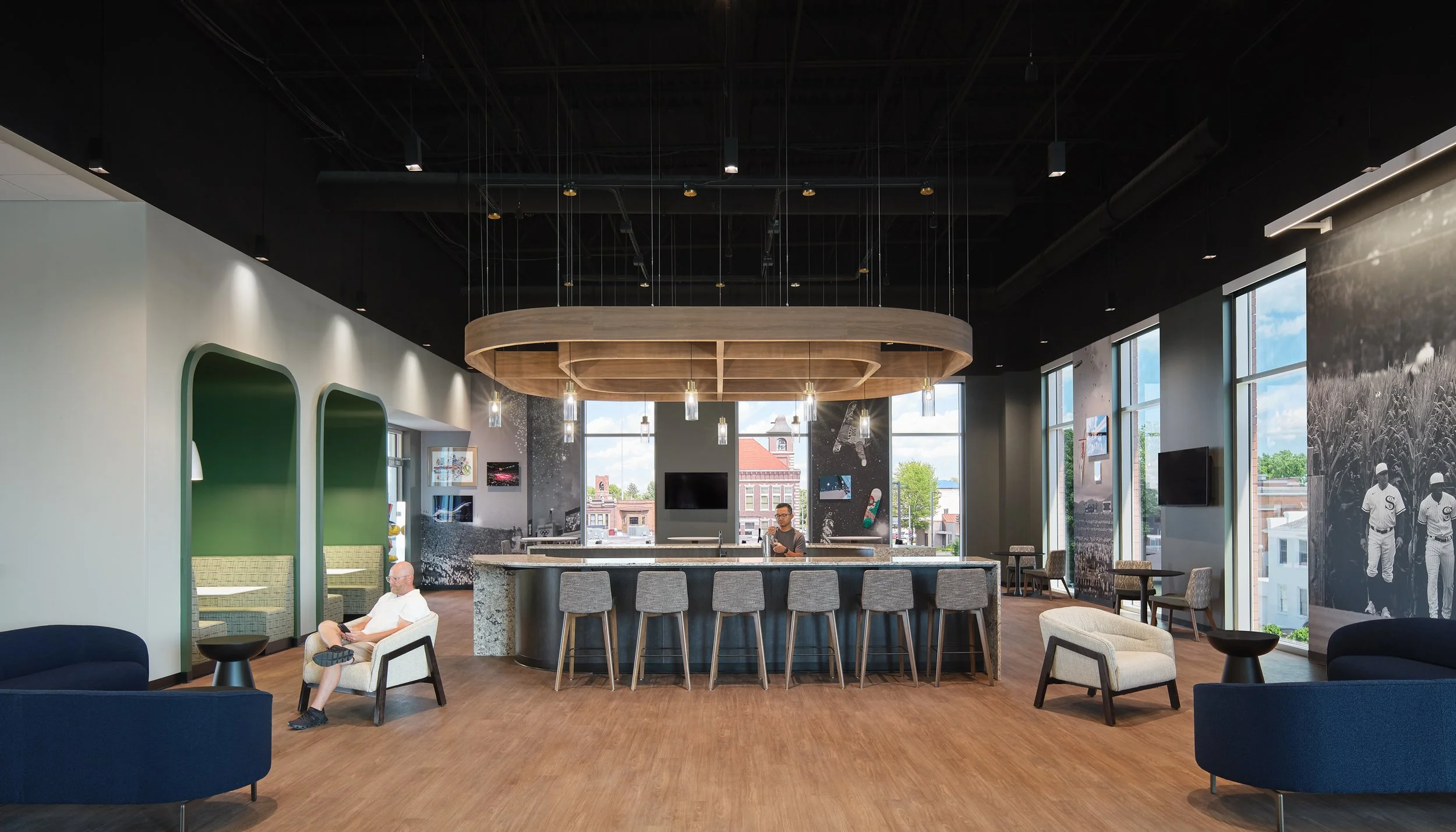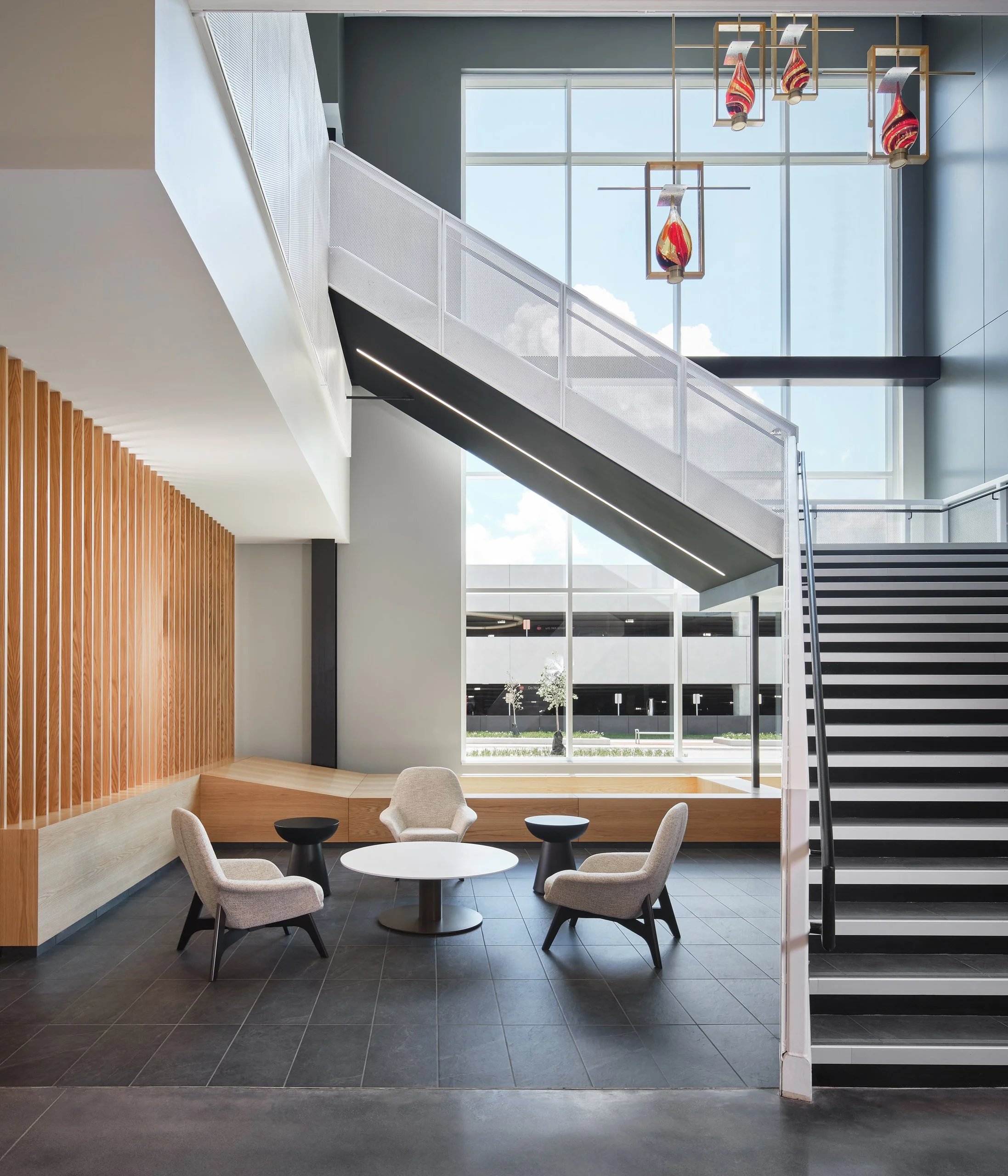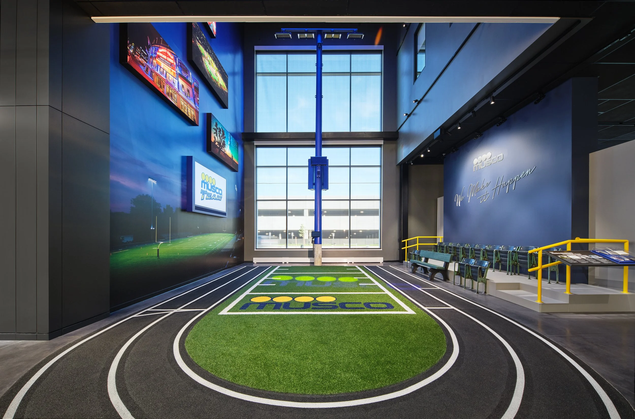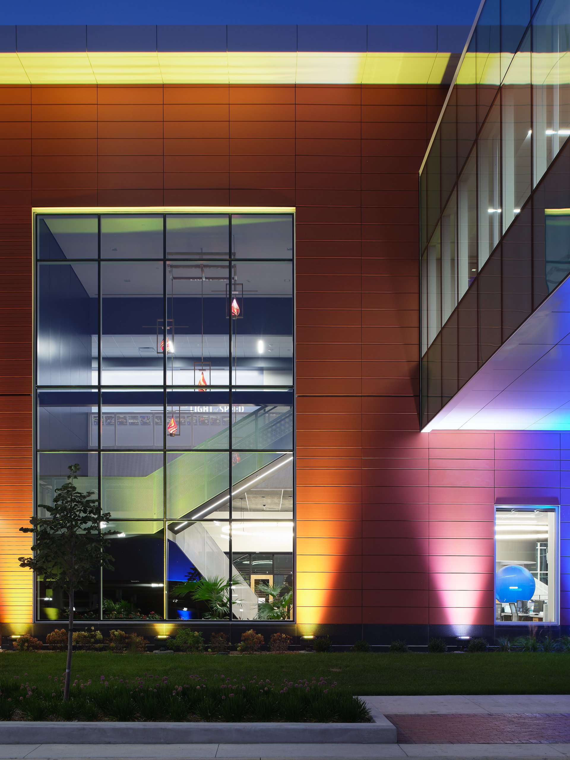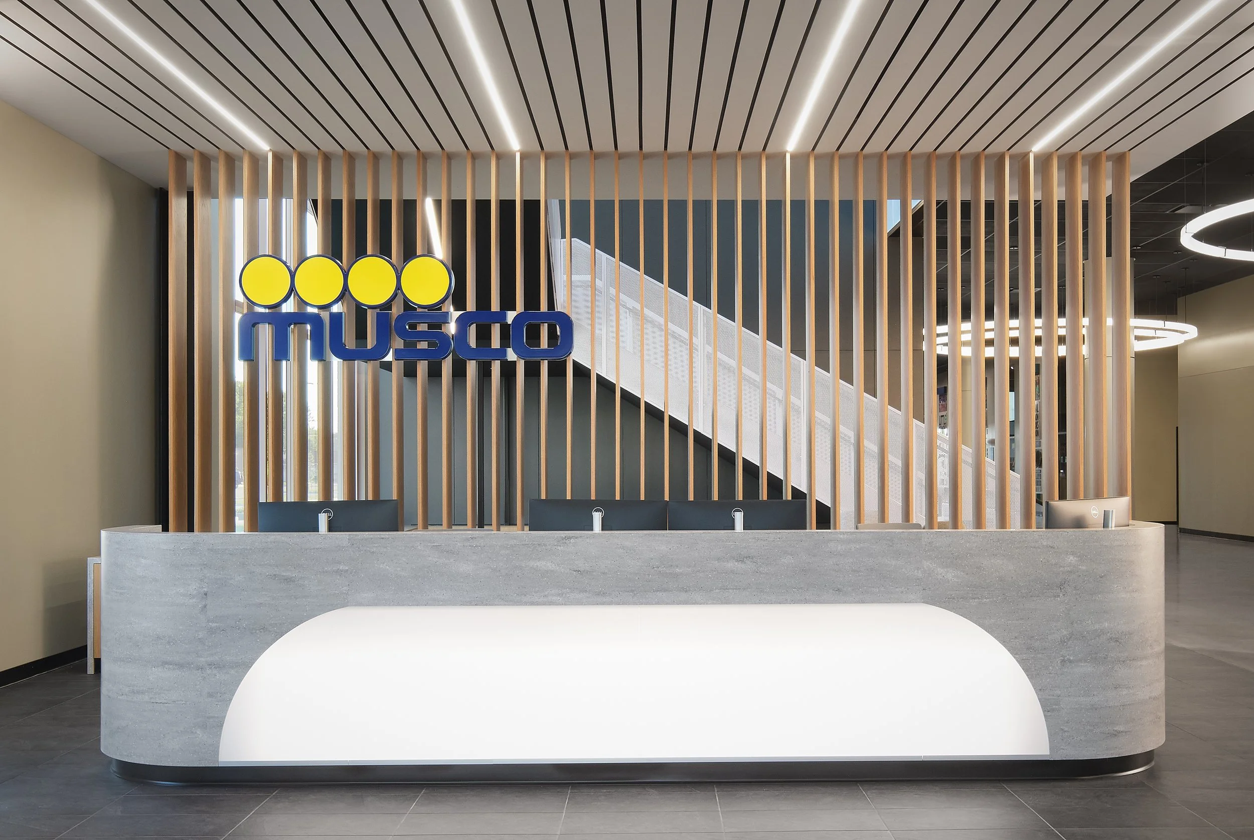 Musco Sports Lighting recently underwent a 74,000 square-foot office renovation and expansion at their corporate headquarters located in downtown Oskaloosa, IA. With design lead by SVPA Architects and construction completed by Neumann Brothers of Des Moines, IA, a three-floor parking garage was also added to help accommodate employees - holding approximately 400 vehicles connected by a second story skywalk. Providing both architectural photography and aerial drone photography was critical to help capture the scale of the project and share the story of the companies vision and expansion.